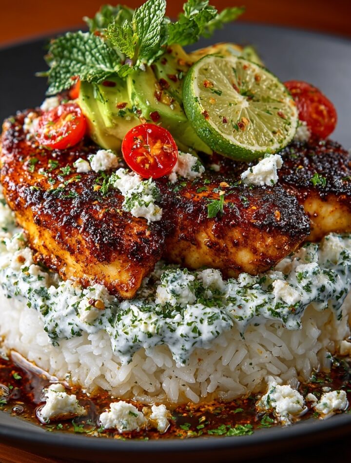 Crispy, deeply seasoned air-fried chicken served over fluffy rice mixed with a creamy herb yogurt sauce, finished with avocado, cherry tomatoes, feta, lime, and a spicy oil drizzle.