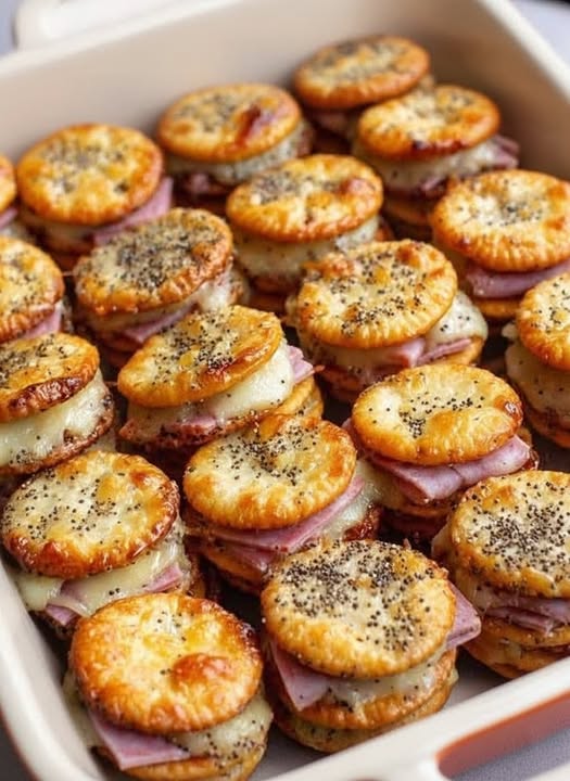 In a bowl, stir together melted butter with Worcestershire, onion powder, Dijon mustard, and brown sugar. Brush on top of each cracker. Add a sprinle of poppy seeds to each cracker too.