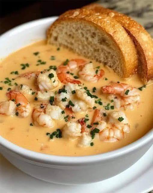 A velvety, buttery soup loaded with tender shrimp, sweet crab meat, aromatics, and a touch of sherry or cream for classic bisque richness.