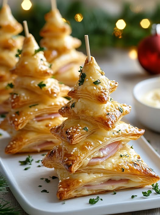 Golden Holiday Puff Pastry Trees with Ham and Melty Cheese