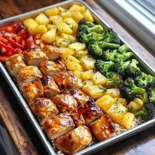Add chicken pieces, bell peppers, onion, and pineapple to the sheet pan.