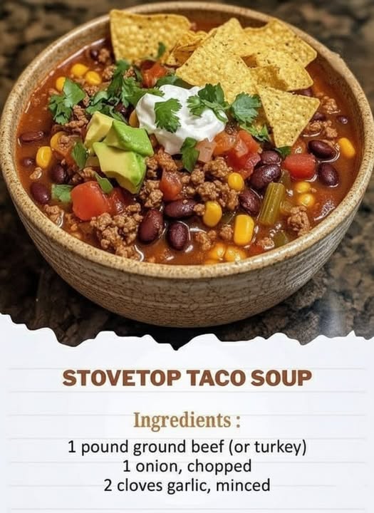 This stovetop taco soup is everything you love about tacos in a warm, comforting bowl. Loaded with seasoned ground beef, beans, corn, tomatoes, and bold spices, it’s hearty, cozy, and ready in under 30 minutes. Perfect for weeknight dinners, meal prep, or feeding a crowd!