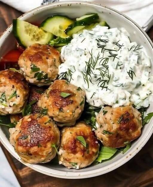 These tender chicken meatballs are pan-seared until golden and juicy, packed with fresh herbs and garlic. They’re served over crisp greens with cool cucumbers and a generous scoop of homemade tzatziki—creamy, tangy, and loaded with dill. It’s a balanced bowl: protein-rich, refreshing, and super satisfying without feeling heavy.