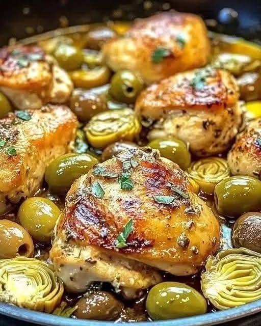 A bright and savory one-pan dish featuring lemony chicken, tender artichokes, briny olives, garlic, and herbs. Perfect for weeknights or guests!