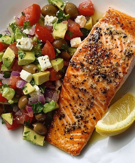 This plate is straight-up flavor goals β tender, perfectly seasoned salmon fillet next to a bold, juicy avocado-Greek salsa that hits with freshness and texture in every bite. Itβs clean, colorful, and ridiculously satisfying. With heart-healthy fats, lean protein, and a citrusy punch, this is how you do a power meal with taste. Great for weeknight dinners or a next-level lunch upgrade.