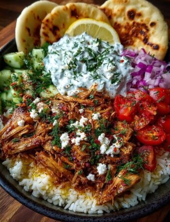 Mediterranean Shredded Chicken Rice Bowl (Serves 3–4) Flavor profile Savory, lemony, herby chicken • fluffy rice • cool garlicky tzatziki …