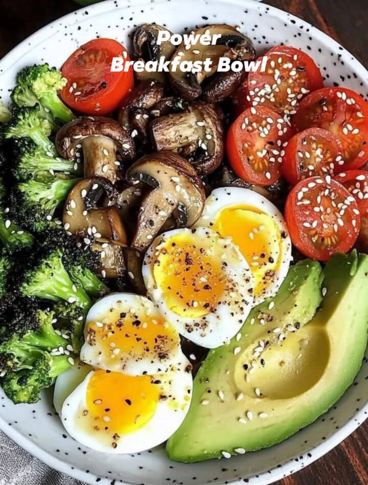Mushrooms, broccoli, tomatoes, avocado, and eggs.