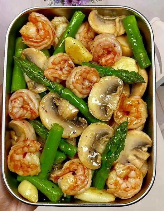 A light, delicious stir-fry with tender shrimp, crisp asparagus, and savory mushrooms tossed in a garlicky soy sauce glaze.