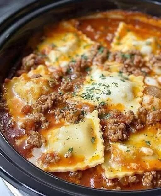 Slow Cooker Ravioli Lasagna (Meaty & Cheesy)