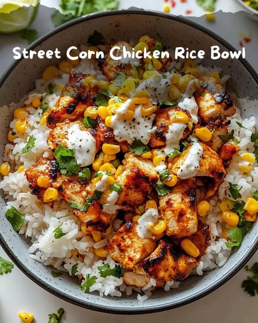 A hearty, colorful bowl layered with juicy chicken, roasted corn, fluffy rice, and a zesty creamy sauce. Perfect for lunch, dinner, or meal prep!