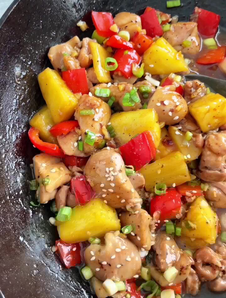 Return chicken to the pan, add pineapple chunks. Stir everything together and cook 2–3 minutes until heated through and sauce thickens.